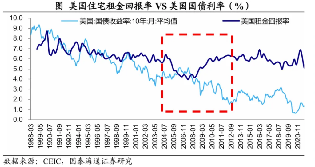 从海外经验来看,美国在2007年房价进入下行周期后,到2012年才止跌回稳。在此期间,美国国债利率降到了2%以下,而房子能够提供的租金回报率甚至一度高于6%。日本房价从1991年开始进入下行周期,到2004年以后才止跌回升,期间东京的房子的租金回报率一度能够提供5%以上。