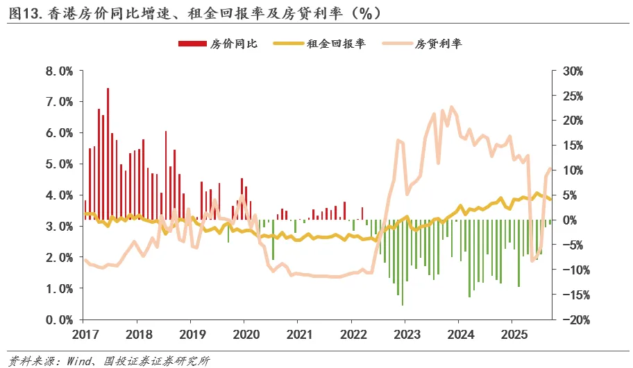 当前香港租金回报率超过房贷利率的格局,不仅改善了投资吸引力,也为房价企稳提供了坚实支撑。这一企稳过程历时15个月,背后是交易成本下降与利率下行的双重作用。据东北证券测算,香港中高端住宅净租金收益率达3.04%,老旧住宅达3.59%。从国际对比来看,东京、香港、纽约等城市的样本住宅净租金收益率普遍达到3%左右。