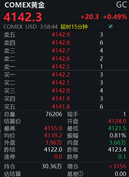 期货方面,COMEX黄金期货亦盘中拉升。截至记者发稿,COMEX黄金期货日内涨0.49%,报4142.3美元/盎司,盘中最高触及4155美元/盎司。