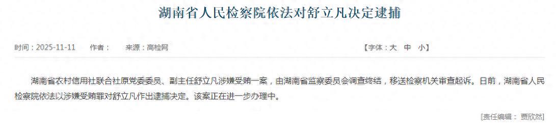 据最高检,湖南省农村信用社联合社原党委委员、副主任舒立凡涉嫌受贿一案,由湖南省监察委员会调查终结,移送检察机关审查起诉。日前,湖南省人民检察院依法以涉嫌受贿罪对舒立凡作出逮捕决定。该案正在进一步办理中。