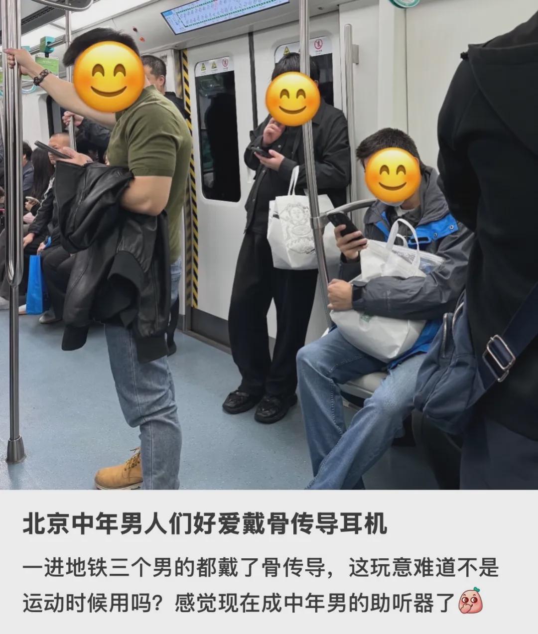 有人说,中年男人的骨传导耳机里,播放的不是摇滚、民谣和朋克,而是修仙小说、郭德纲的相声和新闻联播。“而且好像要跟中年危机对抗似的,他们的耳机颜色一定是高饱和的,绝不和老头耳朵上黑色灰色的助听器撞款。”
