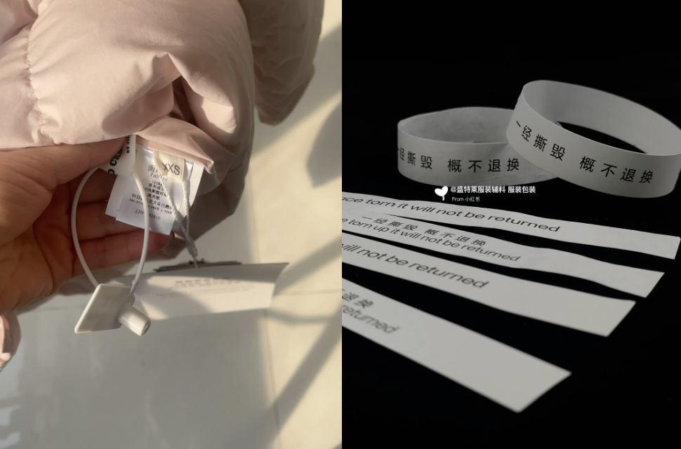 常规做法是面积要大,大到消费者藏不起来,打破想要买来穿几天再退回去的念头。这种吊牌一般用薄卡纸或塑料材质,尺寸最大直逼A4纸,通过防盗扣固定在衣物上,穿上之后,吊牌既没办法简单地拆掉,也没办法平整地放进衣物内正常穿着。