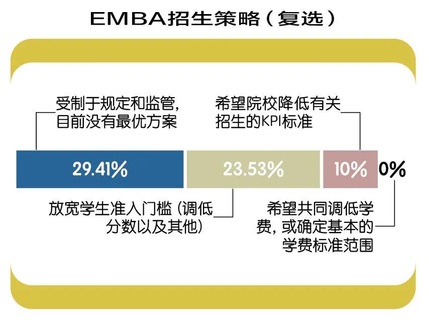 最后,看“EMBA招生策略”。大学商学院的EMBA勾选最多的选项是“受制于规定和监管,目前没有最优方案”,为29.41%;其次是“(希望)放宽学生准入门槛(调低分数以及其他)”,为23.53%;再是“希望院校降低有关招生的KPI标准”,为10%;在“希望共同调低学费,或确定基本的学费标准范围”选项上,没有任何勾选。