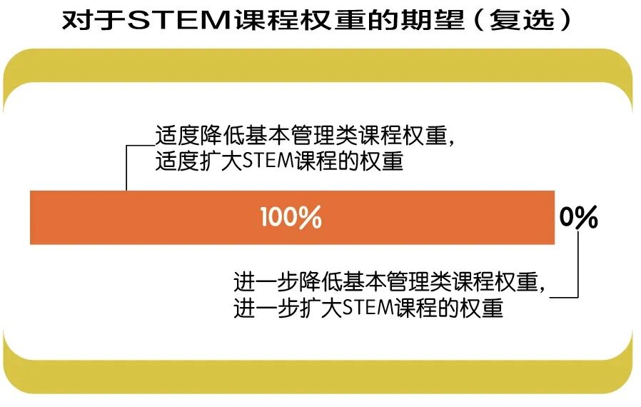 在调研中发现,选满四个选项(可复选)的勾选率高达57.14%,而选定三个选项的勾选率有14.29%。这意味着,国内商学院EMBA项目对于“如何顺利实现‘转向STEM改革’的条件”比较重视。