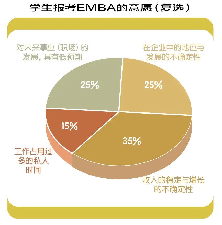 先看“学生报读EMBA意愿”。勾选的最多选项是“收入的稳定与增长的不确定”,为35%。其次是“在企业中的地位与发展的不确定性”“对未来事业(职场)的发展,具有低预期”。两者勾选率均为25%。