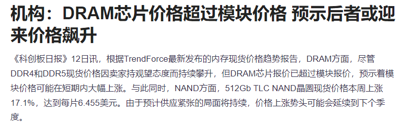 据财联社报道,根据TrendForce最新发布的内存现货价格趋势报告,DRAM方面,尽管DDR4和DDR5现货价格因卖家持观望态度而持续攀升,但DRAM芯片报价已超过模块报价,预示着模块价格可能在短期内大幅上涨。