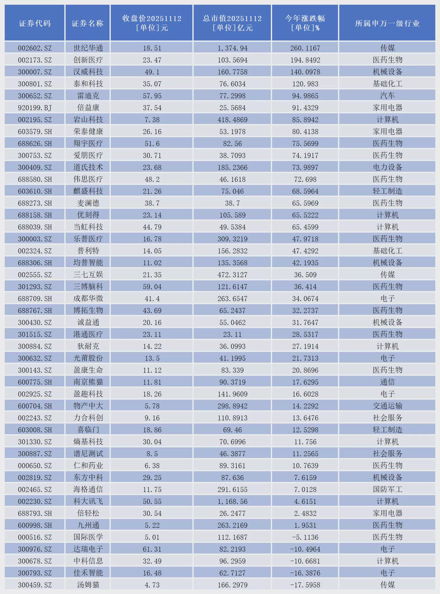 从二级市场表现看,截至11月12日收盘,41家公司股价出现上涨。其中,世纪华通、创新医疗、汉威科技、泰和科技4家公司年内股价已经成功实现翻倍。