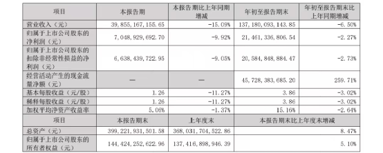 前三季度,公司营收1376.54亿元,同比下降6.62%;净利润214.61亿元,下降2.27%。成为“三巨头”中唯一出现业绩下滑的企业。
