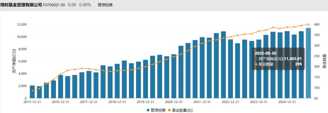 截至2025年9月末,公司总共管理399只公募基金,管理基金规模1.14万亿元,在国内9家公募“万亿俱乐部”成员中位居第8,排名较去年末下降2位,过去四年一直排在第6位。