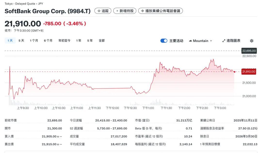 11月12日,在日本股市交易时段,软银股价开盘跳水,一大跌10%,随后跌幅收窄,最终收跌3.46%。