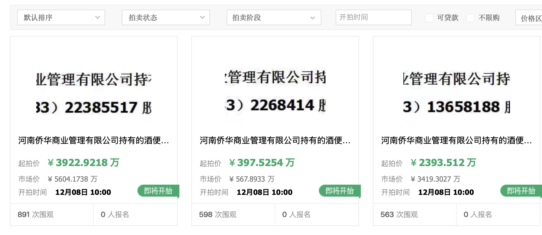 此次拍卖标的物共3份,分别为河南侨华所持有的酒便利2238.5517万股、1365.8188万股、226.8414万股无限售流通股股份,市场价分别为5604.17387万元、3419.30277万元、567.89336万元,起拍价分别为3922.9218万元、2393.512万元、397.5254万元。