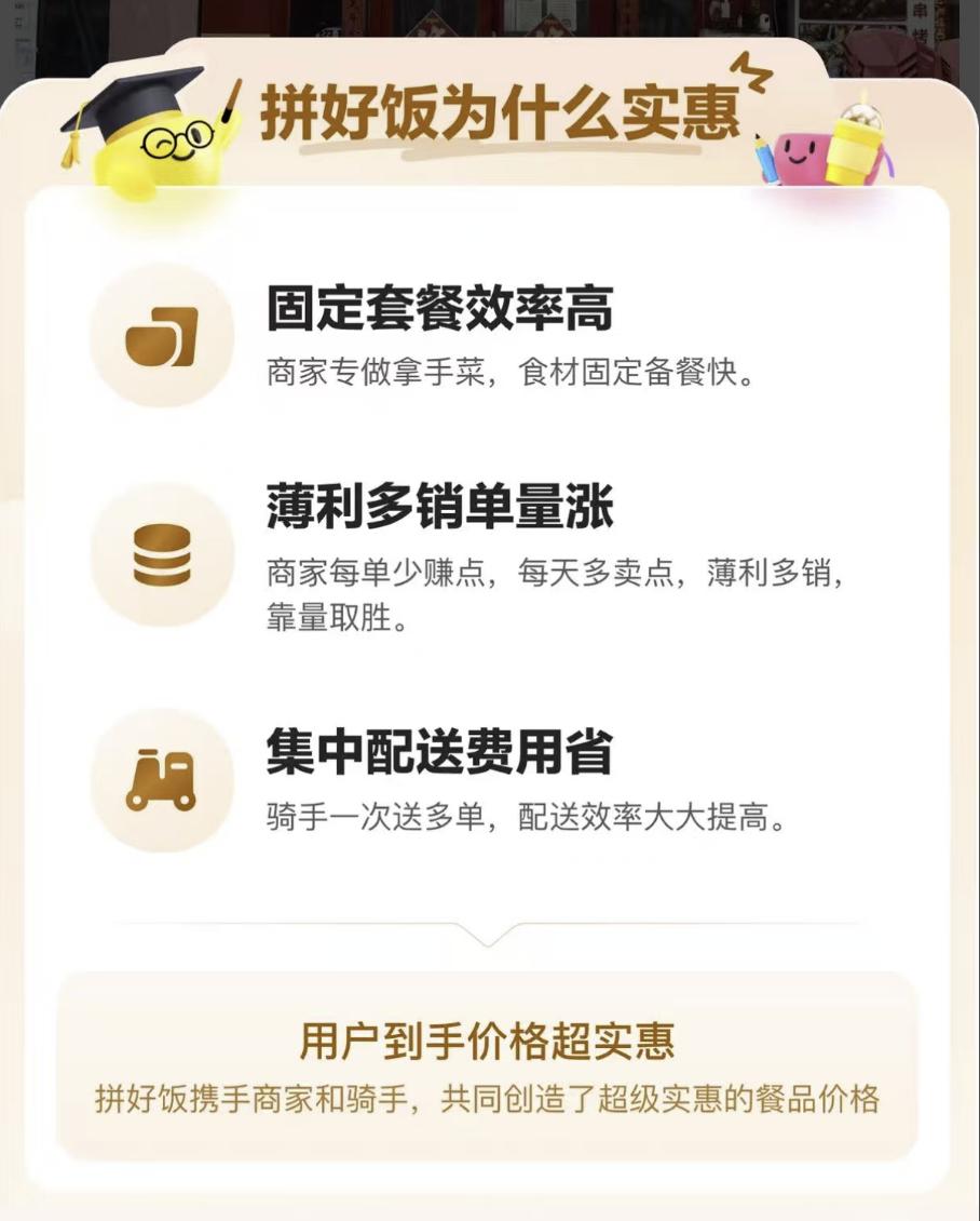数据显示,拼好饭日订单量峰值已超过3500万单,用户超过2.7亿,入驻餐饮品牌超过5000家。专业做拼好饭商家的净利率比平均水平并不差,这证明其低价不是靠补贴硬撑,而是通过全链条效率提升实现的健康平价。