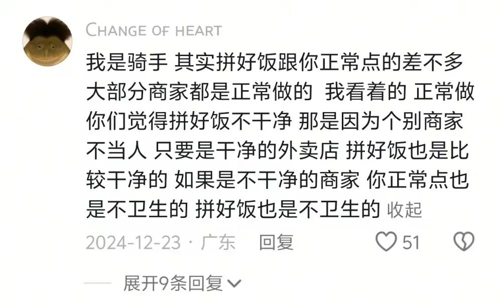 与这一变化同时出现的,还有用户口风的转变。从全网玩梗“吃拼好饭吃的”,到“打工人最后的兜底”的真香平价,拼好饭在社交平台上的口碑正在经历一场两极反转,用户和骑手开始自发为它正名:“店和东西都一模一样,就是价钱不一样。”