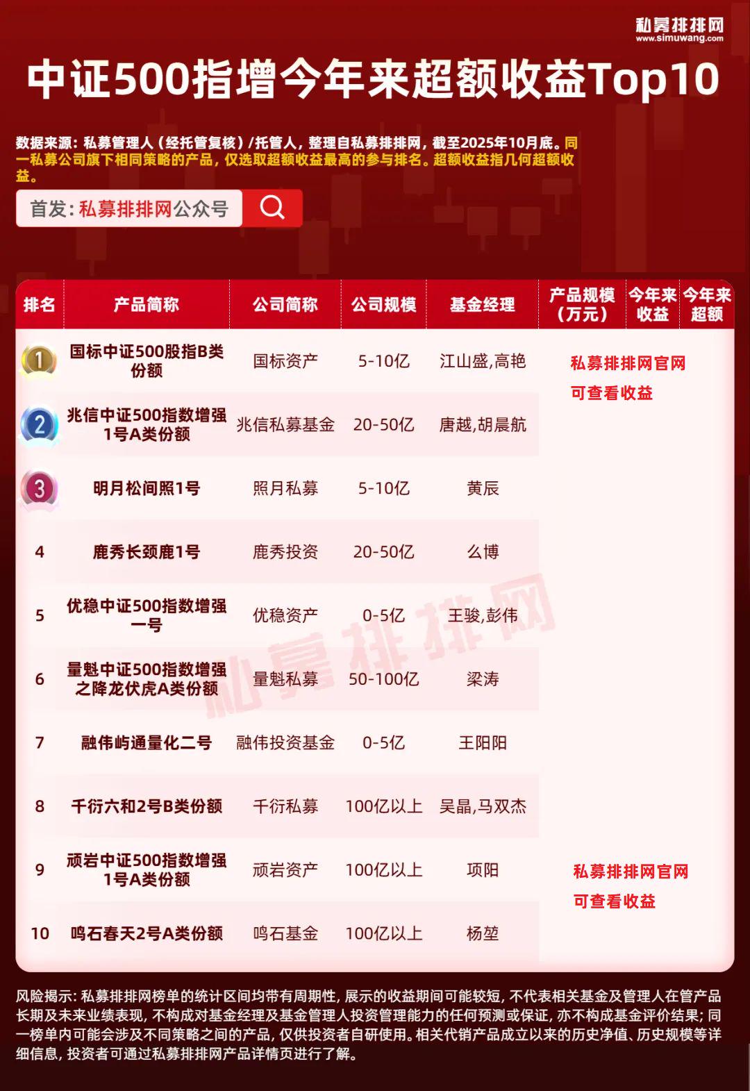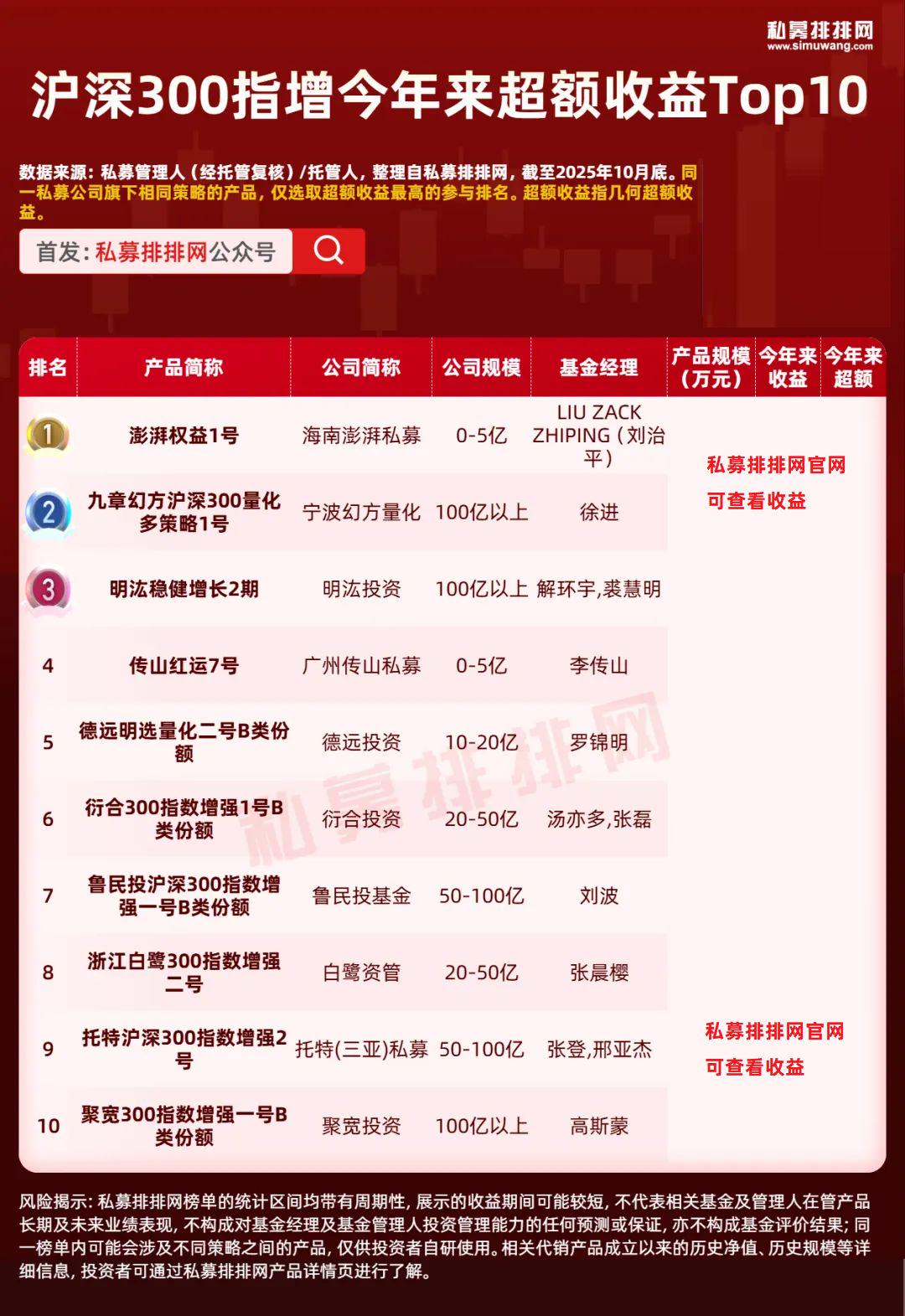 在沪深300指增产品中,今年来超额收益10强产品的上榜门槛为***%。头部私募(规模50亿以上)占据一半。收益位列前3的产品分别由海南澎湃私募刘治平、宁波幻方量化徐进、明汯投资解环宇和裘慧明管理。