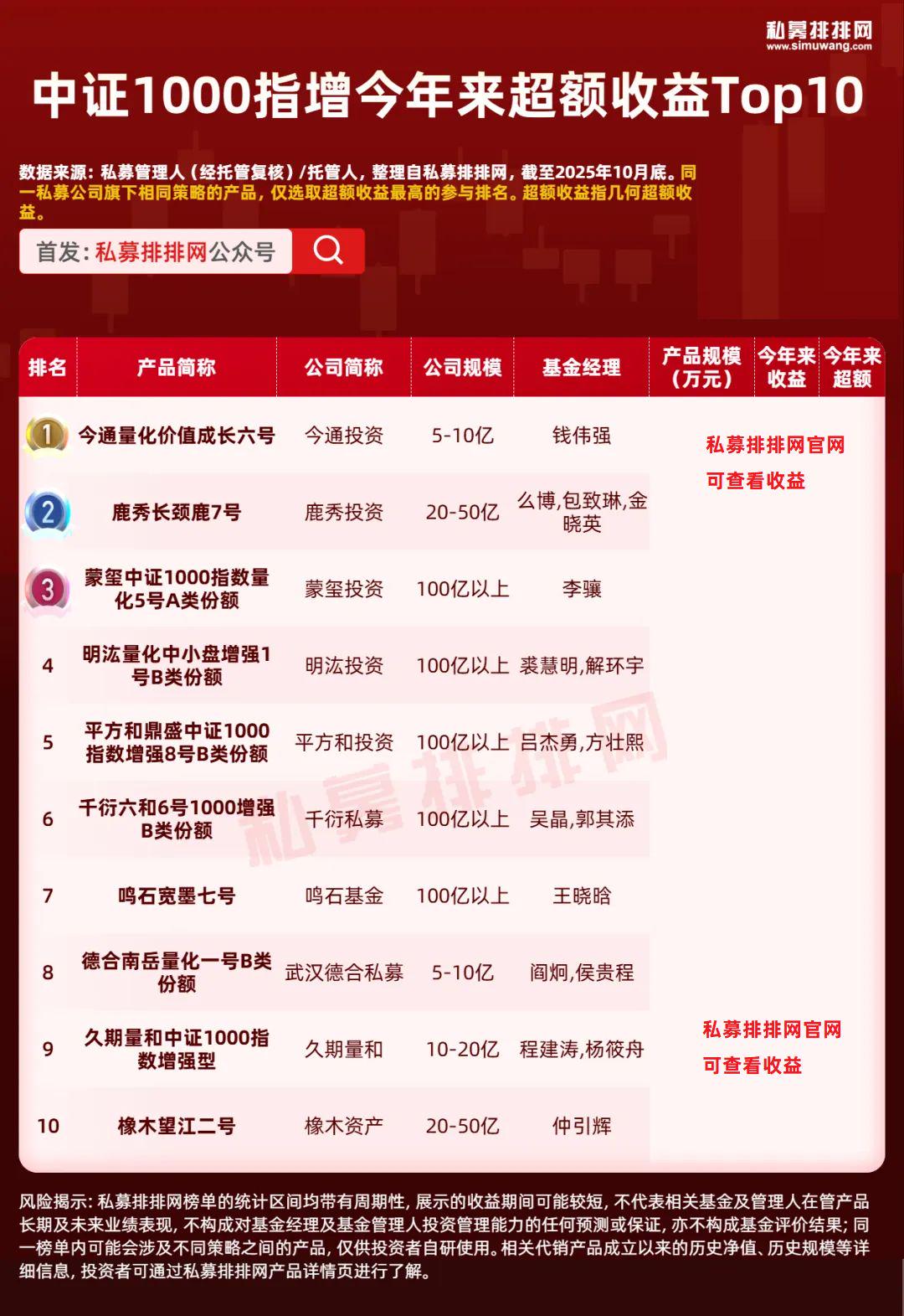 在中证1000指增产品中,今年来超额收益10强产品的上榜门槛为***%。从所属公司的规模来看,百亿私募旗下产品占据一半。收益位列前3的产品分别由今通投资钱伟强,鹿秀投资么博、包致琳和金晓英,蒙玺投资李骧管理。