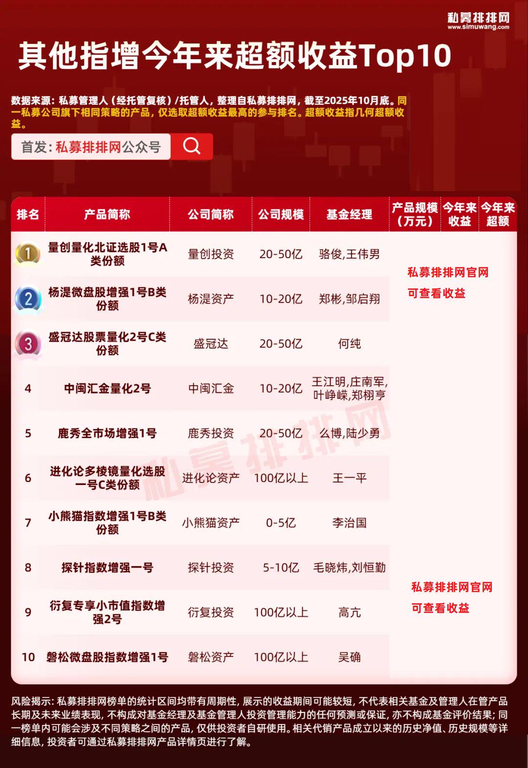 在其他指增产品中,今年来超额收益10强产品的上榜门槛为***%。其中,百亿私募旗下产品共有3只,其他产品所属私募的规模均为50亿以下。收益位列前3的产品分别由量创投资骆俊和王伟男、杨湜资产郑彬和邹启翔、盛冠达何纯管理。