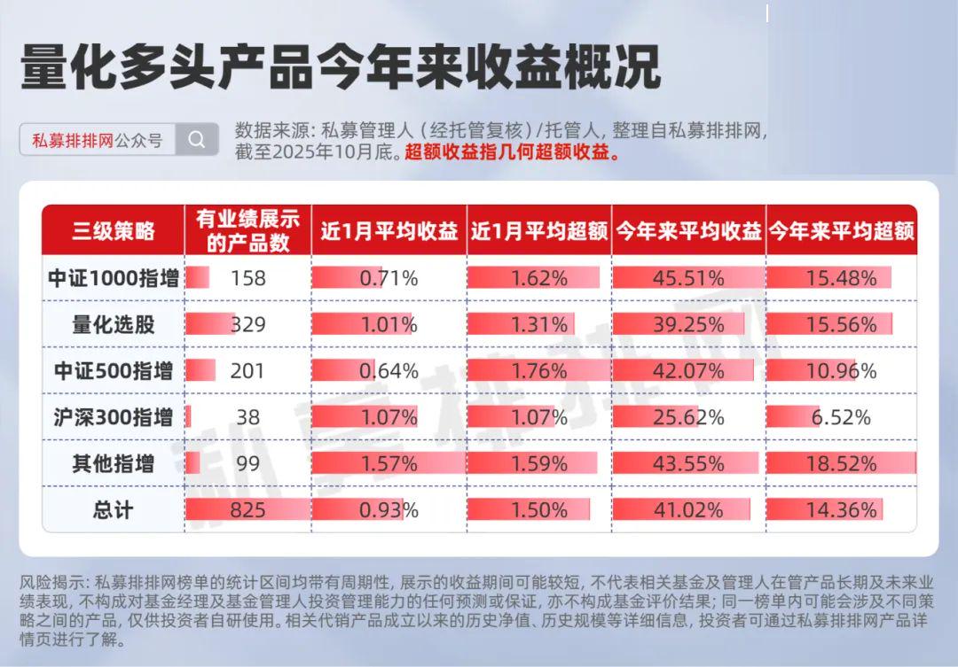 10月以来,A股市场进入震荡轮动行情,量化产品的收益出现显著修复。私募排排网数据显示,在有收益展示的量化多头产品共有825只,今年来平均收益、超额收益分别为41.02%、14.36%。其中,量化多头产品10月平均收益在所有股票策略产品中最高,达到0.93%,平均超额收益为1.5%。