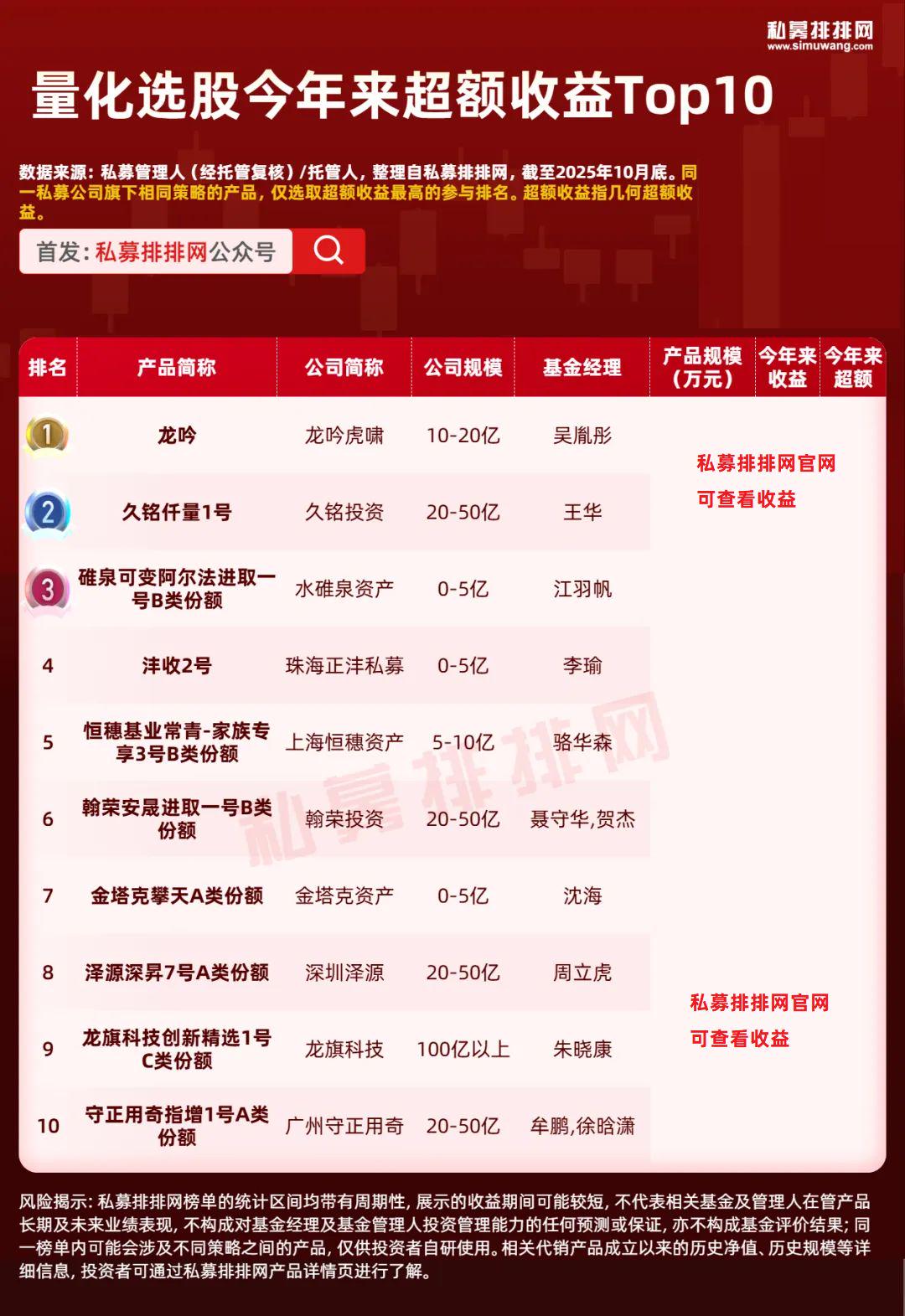 在量化选股产品中,今年来超额收益10强产品的上榜门槛为***%。其中,上榜的百亿私募产品仅有龙旗科技一家,其他产品的所属公司的规模均在50亿以下。收益位列前3的产品分别由龙吟虎啸吴胤彤、久铭投资王华、水碓泉资产江羽帆管理。