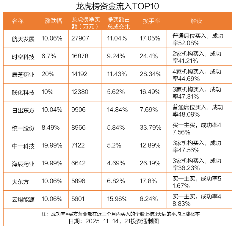 11月14日,上证指数下跌0.97%,深证成指下跌1.93%,创业板指下跌2.82%。盘后龙虎榜数据显示,共有47只个股因当日异动登上龙虎榜,资金净流入最多的是航天发展(000547.SZ),达2.79亿元。