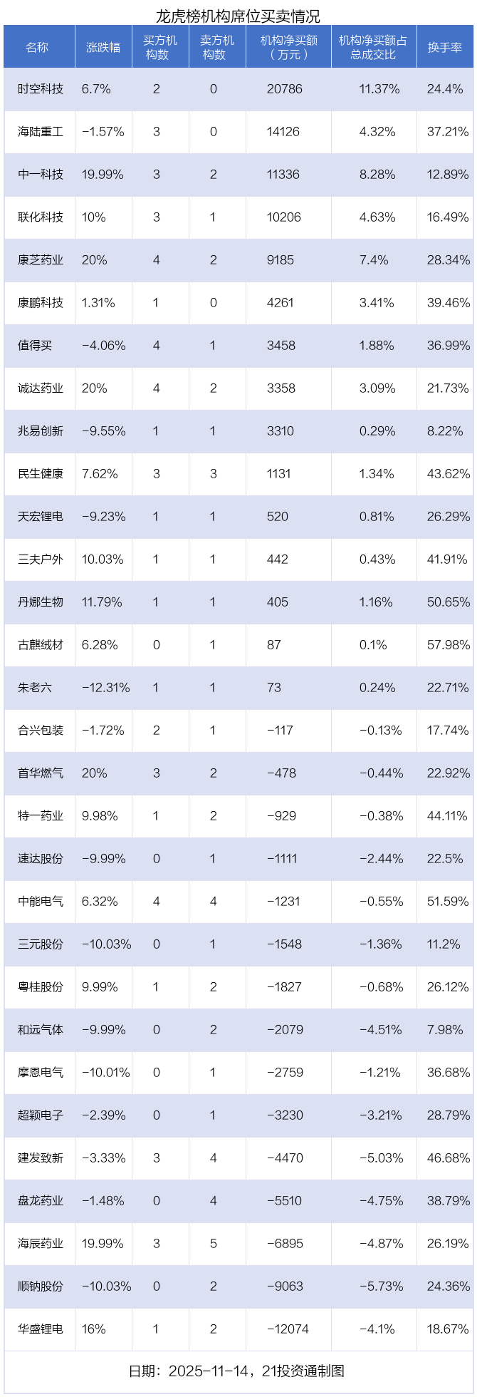 其中,机构净买入金额最多的是时空科技(605178.SH),当日收盘上涨6.7%,换手率为24.4%。
