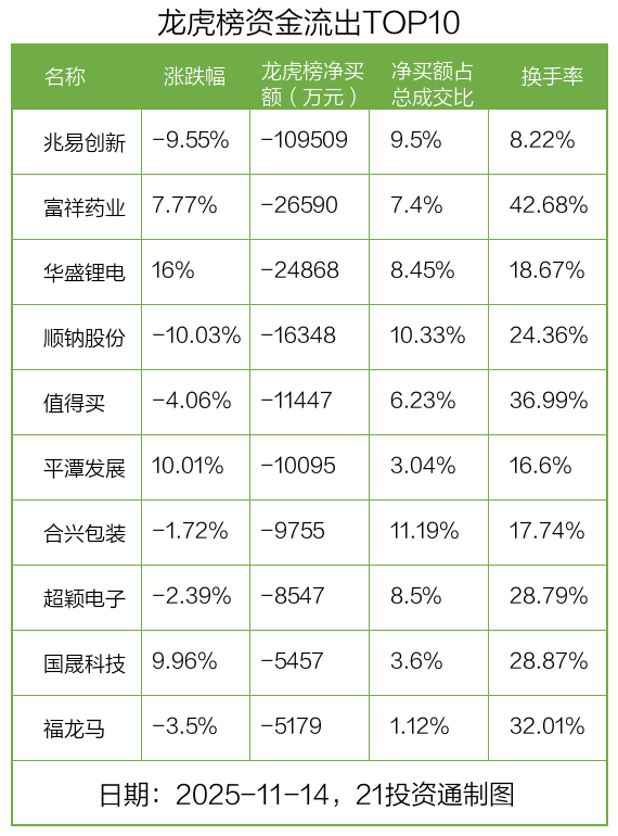 而龙虎榜中资金净流出最多的是兆易创新(603986.SH),被净卖出为10.95亿元,占总成交金额的9.5%。兆易创新收盘下跌9.55%,换手率为8.22%。