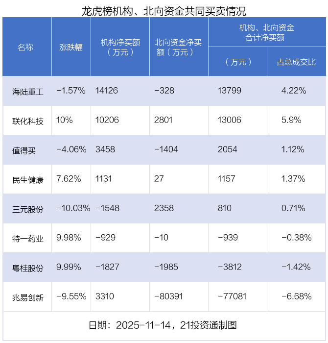 值得注意的是,机构和北向资金共同净买入了联化科技、民生健康等2股;共同净卖出了特一药业、粤桂股份等2股;在三元股份,海陆重工,值得买,兆易创新上出现分歧,机构净卖出三元股份1547.71万元,北向资金净买入2357.92万元;机构净买入海陆重工1.41亿元,北向资金净卖出327.66万元;机构净买入值得买3457.69万元,北向资金净卖出1403.95万元;机构净买入兆易创新3310.03万元,北向资金净卖出8.04亿元。