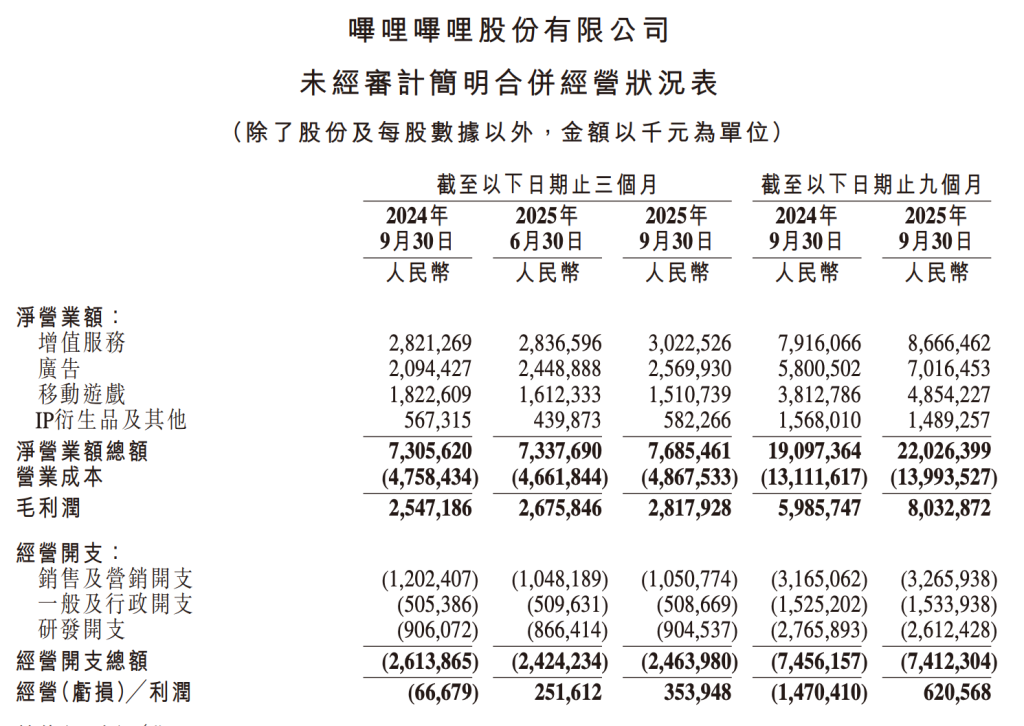 具体到不同业务上,财报显示,三季度B站增值服务总营收为30.2亿元,较去年同期增加7%,主要由于付费会员及其他增值服务的收入增加所致;广告营业额为25.7亿元,较去年同期增加23%,主要由于广告产品供应改善及广告效益提升所致。