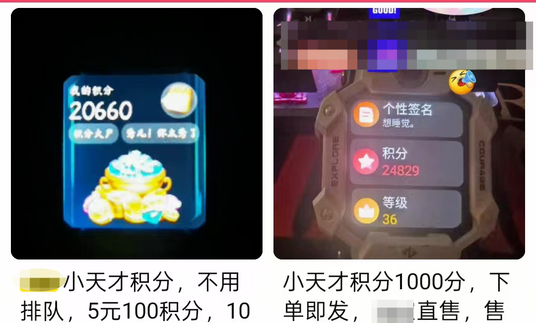 此外,小天才手表中的勋章、积分、权益卡等虚拟物品均可单独售卖,例如积分,1000积分的售价约为50元至100元。