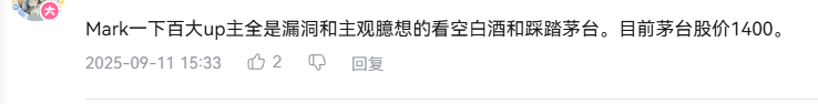 更有甚者直接说全是漏洞,主观臆想看空白酒踩踏茅台。我还专门去查了一下他发这条评论那一天茅台的股价是1500多,按理说炒股票的朋友应该对数字是最敏感的,这股价差出100块了,这怎么能搞错呢!