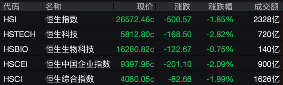 港股亦下挫,恒生指数跌近2%,恒生科技指数尾盘一度大跌超3%。