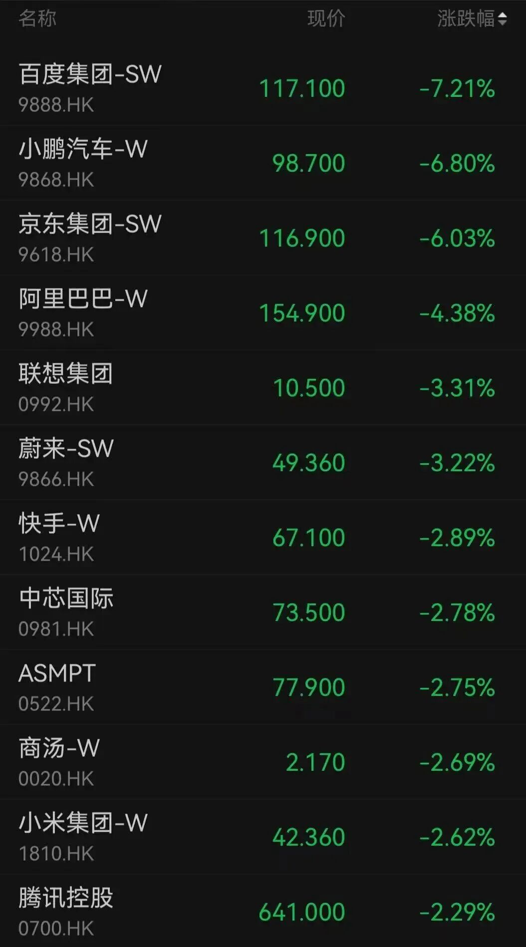 大型科网股普跌,百度集团跌约7%,京东集团跌约6%,阿里巴巴跌超4%,腾讯控股、小米集团、中芯国际、美团均跌超2%。