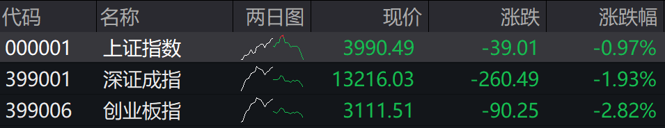 截至收盘,沪指跌0.97%,深证成指跌1.93%,创业板指跌2.82%。