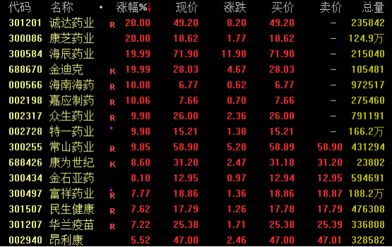 医药板块今日逆市活跃,创新药、生物疫苗概念等表现亮眼,截至收盘,诚达药业、康芝药业、海辰药业、金迪克等20%涨停,众生药业、特一药业亦涨停,常山药业涨近10%。