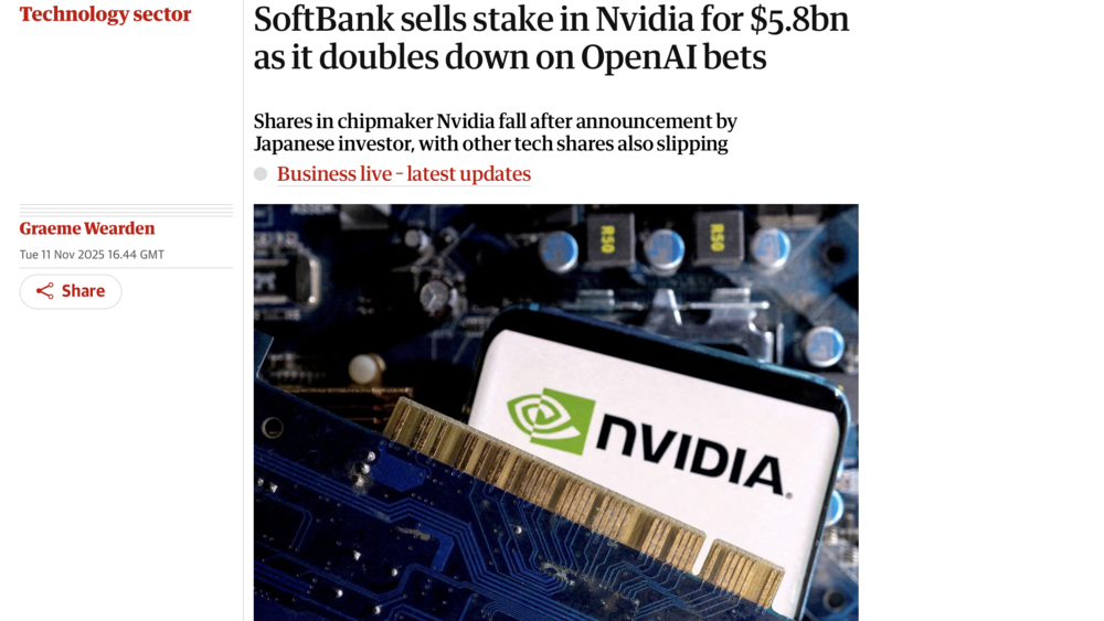 软银的态度也很说明问题——在市值顶部附近迅速清仓英伟达,把账面利润抽走,转身投向OpenAI。这不是看空AI,而是重新选择在价值链中更靠前的位置站队。