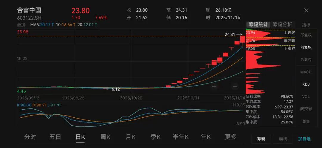 盘面上, 合富中国 今日 尾盘一度涨停,走出14天13板;但随后股价快速走低,截至收盘,涨幅为7.69%,报23.8元/股,成交额超26亿元。合富中国在此前数个交易日已连续发布公告提示风险。