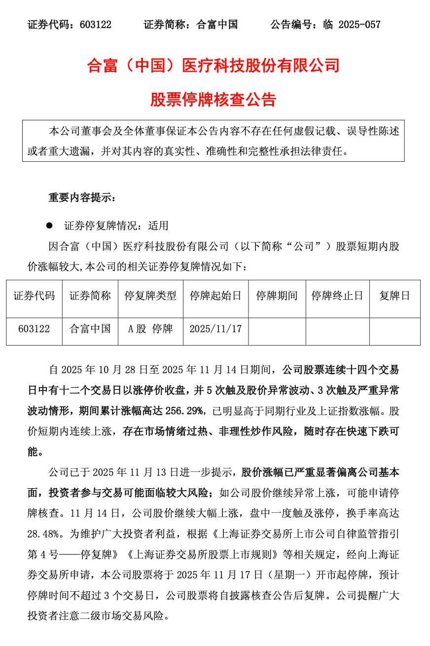11月14日晚间,合富中国公告称,公司股票连续十四个交易日中有十二个交易日以涨停价收盘,累计涨幅高达256.29%,已明显高于同期行业及上证指数涨幅。公司股票将于11月17日开市起停牌,预计停牌时间不超过3个交易日。公司提醒投资者注意二级市场交易风险,当前股价与公司经营业绩、行业情况严重偏离。