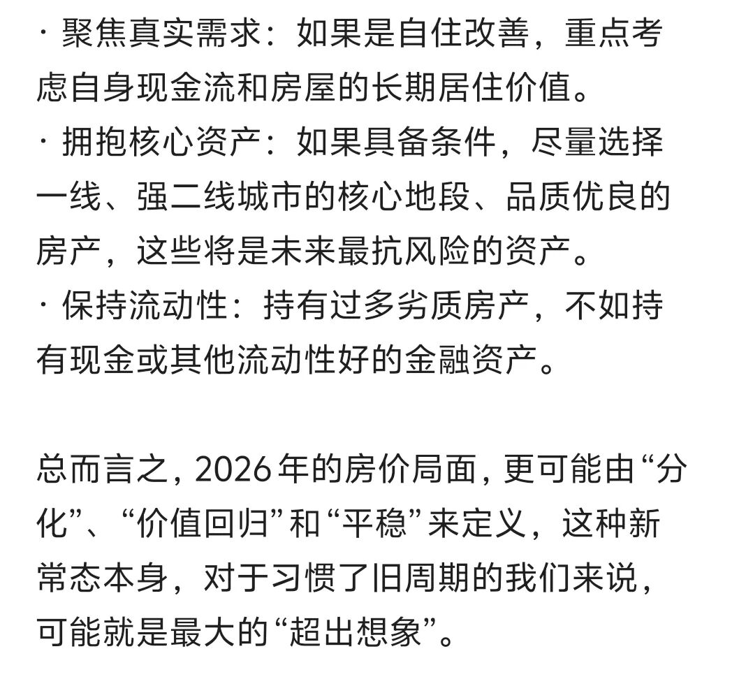 展望2026年,房价走势并非“注定”,而是多重力量博弈的结果。政策托底与市场分化并存,核心资产或展现韧性,非核心区域则面临价值重估。未来楼市将告别普涨神话,转向“居住属性”与“品质为王”的时代。这一转变可能远超想象——不是价格的暴涨暴跌,而是逻辑的根本颠覆。理性看待住房的消费品本质,拥抱分化、聚焦真实需求,或是应对未来变局的最优解释