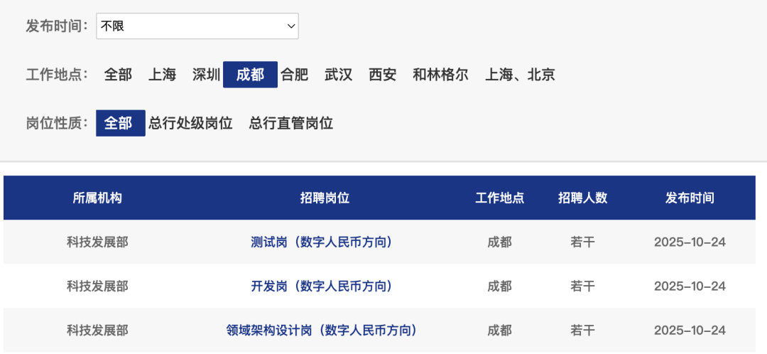 至于数字人民币业务运营机构的扩容,有股份行已经采取行动。记者注意到,浦发银行于10月24日在官网社会招聘中发布了一系列招聘信息,科技发展部拟招聘数字人民币方向的测试岗、开发岗和领域架构设计岗,且工作地点均在成都。