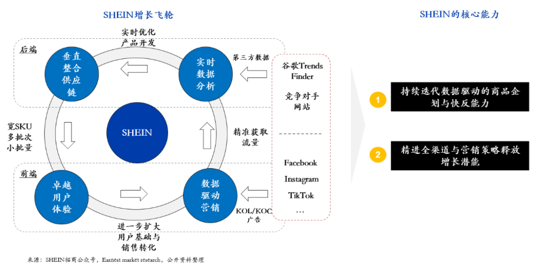 因此,如下图,真正构建SHEIN的破局之道的是其形成的“增长飞轮”。一边是对互联网搜索数据、社交数据、电商数据和买手反馈的融合利用,更加动态地把握市场变化和流行趋势,并将这些市场洞察与设计师地新产品开发结合起来,形成了更多“顺势而为”的新单品,另一边是整合广大OEM企业的柔性供应链能力,实现“小单快反”,即更多的新品可以以更小的起订量、更快的速度生产上市(Zara通常要3-4周,但希音可以1-2周甚至更快),然后在市场上通过实际的销售验证再来决定哪些产品要加大排产和补货,哪些需要快速清货或下架。对于消费者来说,这样的价值显而易见,意味着更多样的、物美价廉的、符合流行趋势的新品选择,对于希音和供应商来说,货品流和资金流都可以更快地实现周转,实现双赢。而这背后,希音在前端通过独立站和社交营销所沉淀的用户交互数据及反馈,又会反哺到对于市场需求变化的把握和新产品开发上面,形成无缝的业务闭环——这才是SHEIN得以突围的关键竞争护城河。