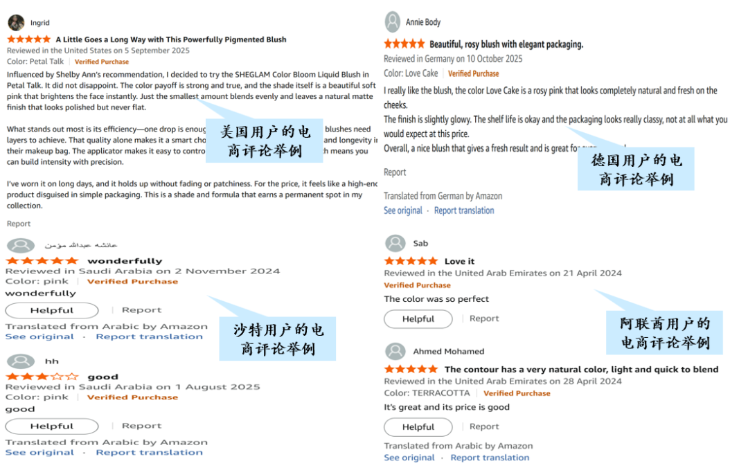 但更大的挑战在于,如何做好市场洞察来决定生产什么更能满足不同海外市场的用户需求?因此,SHEGLAM更加看重来自社交与电商平台的用户反馈,并结合粉丝调研等方式来洞察需求偏好与区域差异。当然,不同区域的用户在线上所能提供的有效反馈是不同的。例如,在中东地区,女性用户对SHEGLAM产品满意只会用非常简短的肯定用词(如“非常满意”、“值得拥有”等)做电商评论;但美国、德国等成熟市场的用户可能更容易以更长篇幅来表达对SHEGLAM产品的肯定或问题的反馈(参如下SHEGLAM在亚马逊平台的用户反馈对比)。所以,理解这些区域因素差异,SHEGLAM也同样重视结合不同地域的气候、文化、生活习惯等差异来开发适配特定区域的新产品。例如,在中东开发更符合当地肤色的粉底液,满足当地消费者对肤色修饰的需求;为适应中东、东南亚的高温环境,推出“16小时持妆力”定妆喷雾,解决防脱妆痛点等。