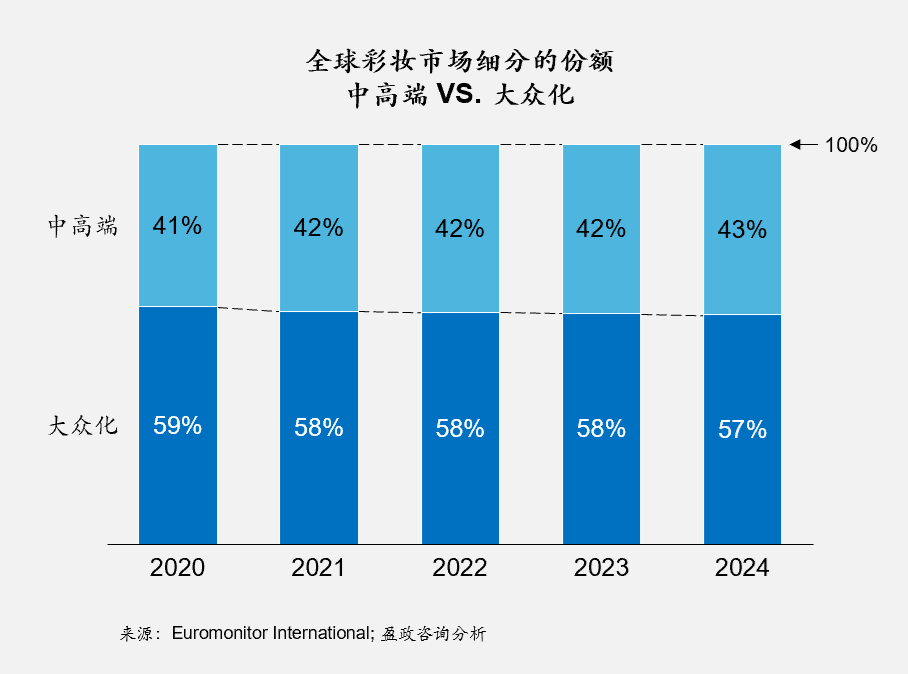 在这样的背景下,一个新锐品牌要如何破局?SHEGLAM团队显然看得到,尽管彩妆大牌们占据了有利的市场地位,但他们普遍占据了更高价格带的市场空间,而如果将市场机会按价格带四等分,后50%价格带的参与企业之市场占有率并没有那样集中,反而份额更为分散。值得注意的是,彩妆市场如果按Euromonitor的中高端和大众划分,大众市场的规模占比更为可观(见下图)。