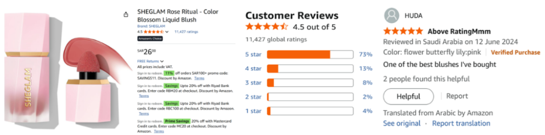 从市场反馈来看,SHEGLAM的“有品质+买得起”的定位得到了用户的积极肯定。不仅仅在自身的独立站上诸多单品获得了高用户评分,以SHEGLAM在亚马逊跨境电商平台为例,其代表单品(以液体腮红为例)也得到了如沙特、阿联酋女性的高评分和积极评论。