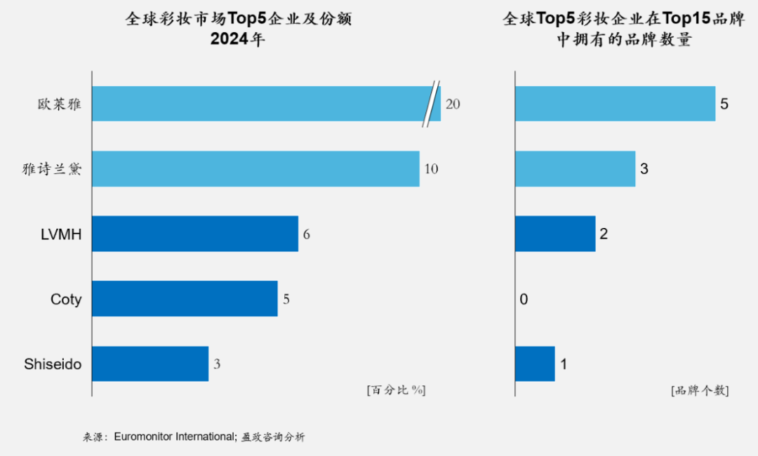 在一个过去五年保持6.3%的年复合平均增长率(2020-2024年CAGR, 来源:Euromonitor)、全球近8000亿美元的彩妆消费市场中,一直以来都是欧美化妆品巨头占据市场主导。以2024年为例,全球前五大彩妆企业合计的市场份额就接近半壁江山(CR5=44%);其中,如果按彩妆企业的品牌份额计,前三大彩妆企业就占据了全球Top15品牌中的10席(参下图)。