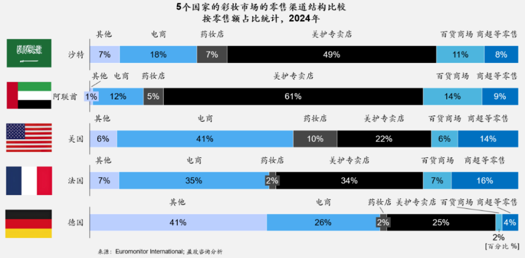 那么,既然建立线下触点来与线上做协同很重要,SHEGLAM如何在线下渠道中做出选择呢?见下图,成熟市场与沙特、阿联酋为代表的中东市场表现出了显著的彩妆渠道结构差异。沙特、阿联酋美护专卖店在零售渠道的重要性显然更高,分别占比49%和61%,而电商渠道是还在持续发展的新兴渠道,甚至百货商场对彩妆的重要性也明显高于美、法、德等成熟市场。相较而言,美国、法国等电商的成熟度要高得多,分别达到了41%和35%,而百货商场的彩妆零售占比仅有6-7%。值得注意的是,根据Euromonitor的统计,在德国,美护/妆专卖店销售彩妆的份额甚至不及健康个护专卖店(health and personal care stores),这也体现出德国在零售专业化细分的要求,以及消费大众对健康管理消费的倾向。