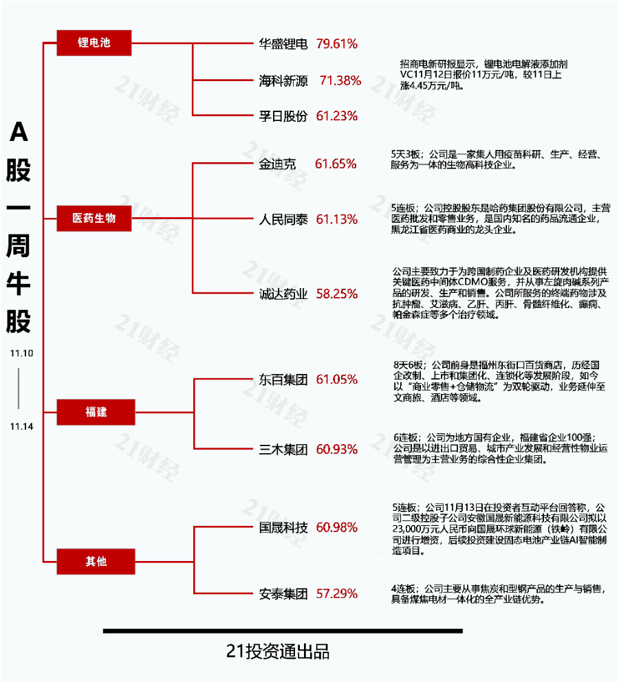 本期牛股榜中,华盛锂电(688353.SH)以79.61%的周涨幅夺魁,海科新源(301292.SZ)以71.38%的涨幅位居第二,金迪克(688670.SH)、孚日股份(002083.SZ)、人民同泰(600829.SH)、东百集团(600693.SH)周涨幅超61%。本期牛股榜十只个股过去一周累计涨幅均超过57%。
