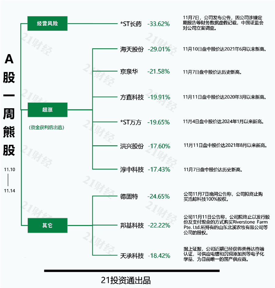 本期十大熊股中,*ST长药(300391.SZ)以33.62%的跌幅成为本期的最熊股。海天股份(603759.SH)、德固特(300950.SZ)、邦基科技(603151.SH)、京泉华(002885.SZ)等股的周跌幅均在17%以上。