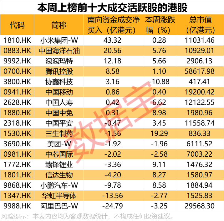 从行情上来看,前十大活跃个股中三生制药本周涨幅最高,达到19.29%,赣锋锂业、小鹏汽车-W、信达生物紧随其后,分别上涨9.11%、8.58%、8.27%。协鑫科技、药捷安康-B、潍柴动力跌幅居前,分别下跌10.88%、7.6%、6.98%。