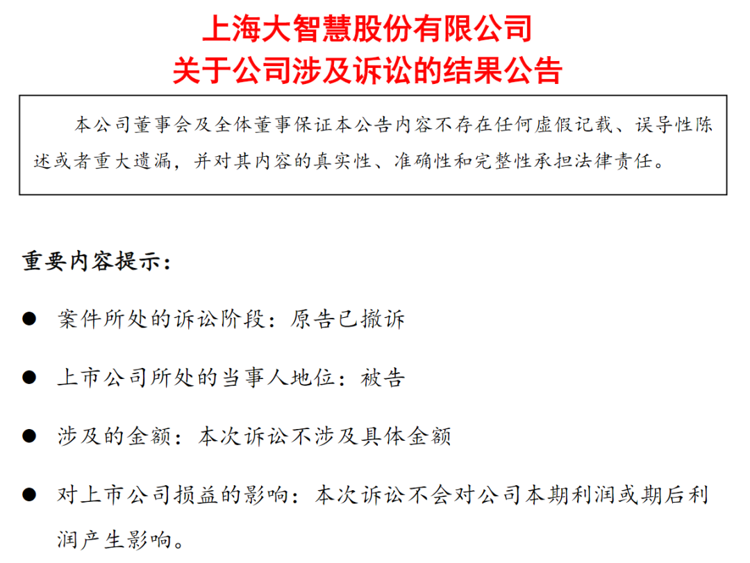 大智慧表示,本次诉讼不涉及具体金额,不会对公司本期利润或期后利润产生影响。