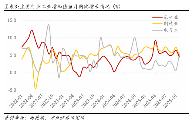 分三大门类看,采矿业、制造业及电热水增加值同比增速出现分化。2025年10月份,采矿业(6.4%→4.5%)和制造业(7.3%→4.9%)增加值有所回落,而电力、热力、燃气及水生产和供应业(0.6%→5.4%)则明显提速。根据统计局数据,从细分行业看,10月份41个工业大类行业中29个行业增加值同比增长,增长面为70.7%。从产品看,10月份在统计的623种主要工业产品中,313种产品产量同比增长,增长面为50.2%。
