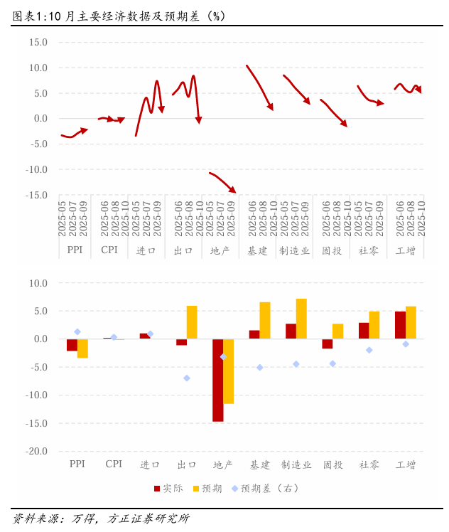 第二,消费和投资表现分化。今年以来,投资和消费均受到“两重两新”等相关政策的显著影响,但在10月的表现却出现了明显的分化。